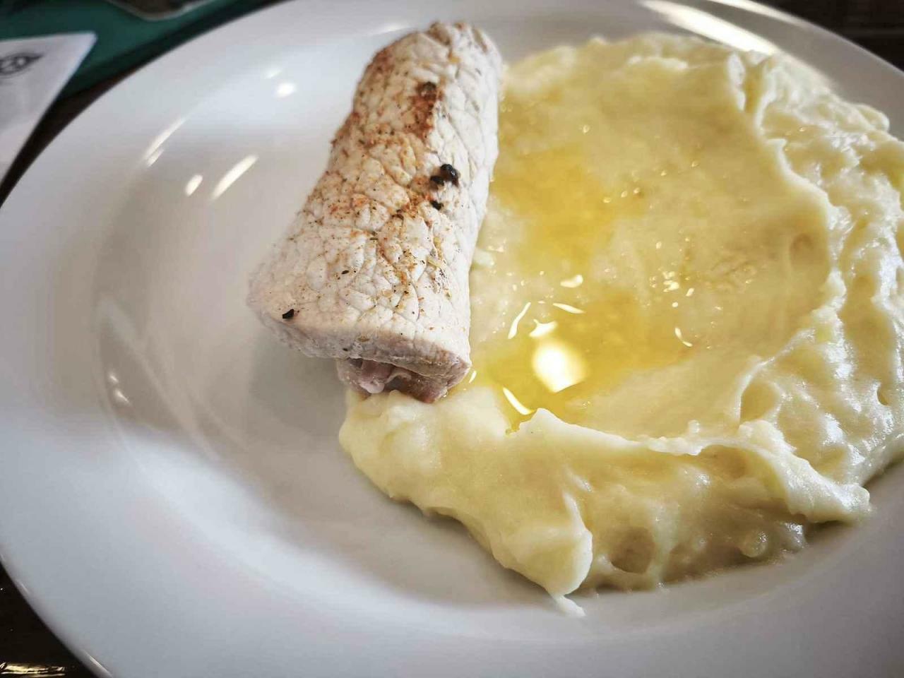 My jsme si místo steaku dali vepřový závitek s bramborovou kaší za příjemných 145 korun. Deník/Petr Vaňous